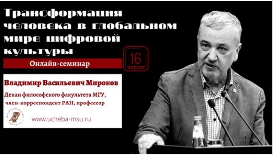 |  |   << Вернуться ко всем новостям Трансформация человека в глобальном мире цифровой культуры интерактивный онлайн-семинар. Владимир Васильевич Миронов 16 апреля декан философского факультета, член-корреспондент РАН Владимир Васильевич Миронов проведет интерактивный онлайн-семинар Трансформация человека в глобальном мире цифровой культуры. Свои вопросы вы можете задавать во время онлайн-трансляции на сайте МГУ.   Ссылка на трансляцию В рамках выступления пройдет обсуждение последствий внедрения новых технологий, которые из чисто вспомогательного средства, увеличивающего комфортность качества жизни людей, превратились сегодня в самостоятельный доминирующий фактор. Человечество вступает в новую стадию своей эволюции, где новые технологии могут создать сверхчеловека. Эти процессы требуют рационального осмысления. Модератор Дряева Элла Давидовна к.ф.н, ст. преподаватель кафедры социальной философии и философии истории, заместитель декана философского факультета МГУ по общим вопросам Эксперт Владимир Васильевич Миронов декан философского факультета МГУ, член-корреспондент РАН, доктор философских наук, профессор #мгу #трансформациячеловека #глобализация #декан #владимирмиронов #философскийфакультет #онлайнтрансляция #интерактив Теги: интерактивный онлайн-семинар, декан философского факультета, член-корреспондент РАН Владимир Васильевич Миронов,#мгу #трансформациячеловека #глобализация #декан #владимирмиронов #философскийфакультет #онлайнтрансляция #интерактив, Планета образования Как правильно  выбрать школу для ребенка?  | |||